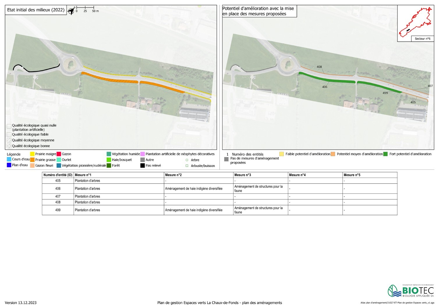 La ville de La Chaux-de-Fonds avait la volonté d'élaborer un plan de gestion et d'entretien de ses espaces verts. En 2022, un premier travail de digitalisation de toutes les surfaces entretenues par la ville a été effectué par nos soins, afin que la gestion puisse se faire via une base de données numérique. L’ensemble des surfaces entretenues par le secteur vert a ensuite été parcouru en printemps-été 2022, afin d’appréhender l’état existant et d’évaluer la qualité et le potentiel de ces espaces verts d’un point de vue de la biodiversité. Les arbres se situant sur ces surfaces ont également tous été recensés. Le diagnostic a permis entre autres de mettre en évidence les déséquilibres en termes de diversité d’essences actuellement plantées et les risques liés.