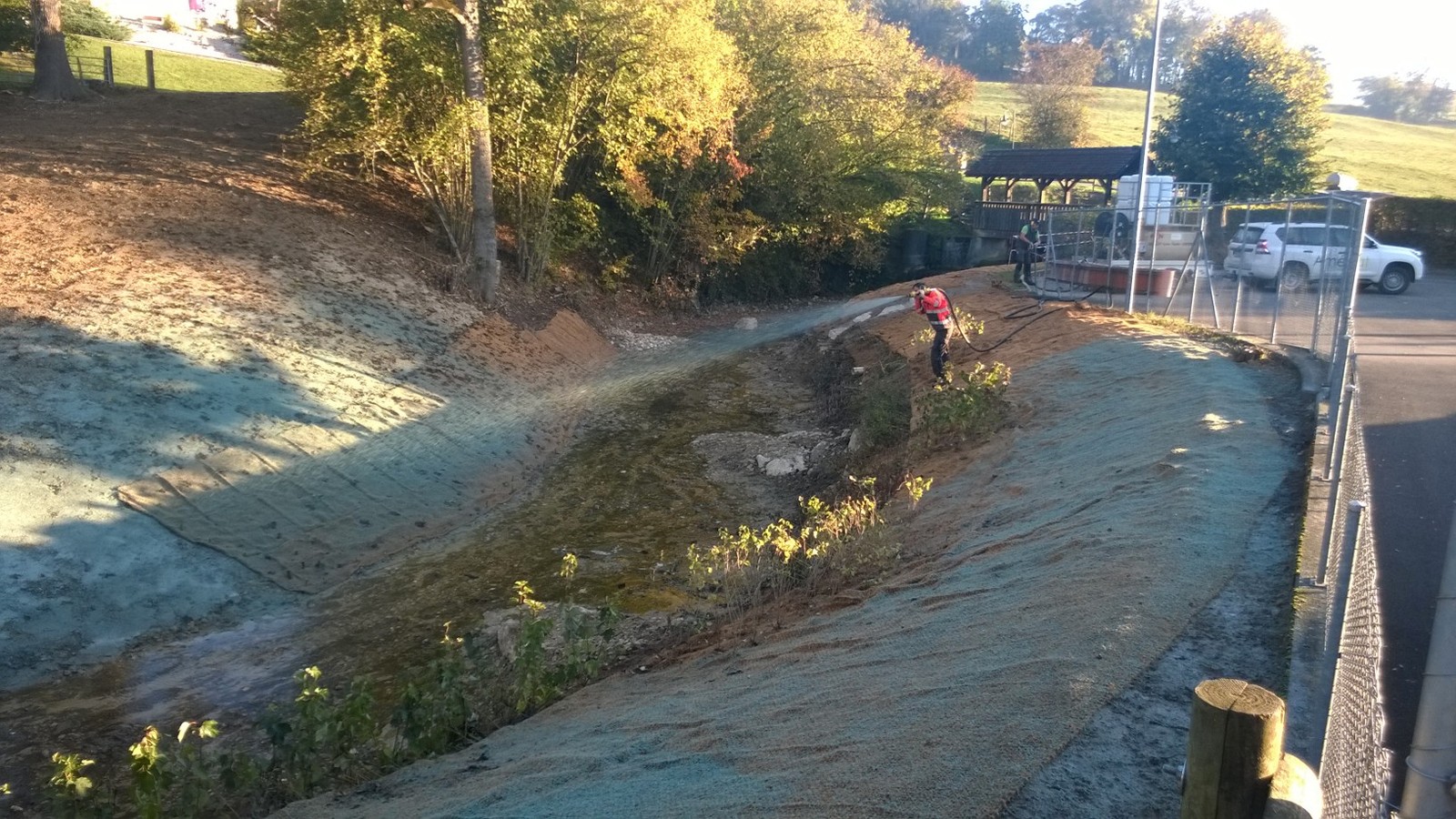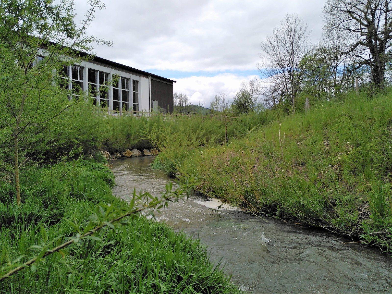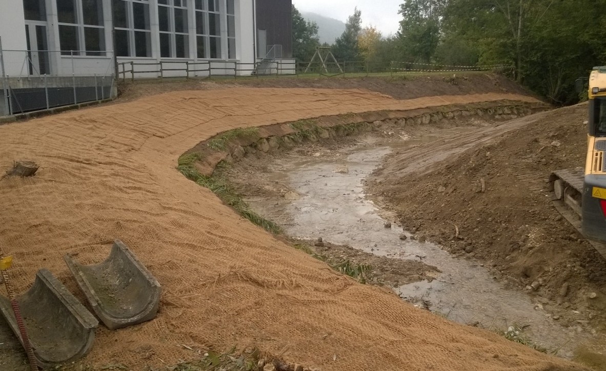 Suite à ce constat une remise en état a été réalisée avec des techniques mixtes et le lit quelque peu décalé afin d’améliorer la sécurité du tronçon. Suite aux travaux préparatoires d’abattage et de débroussaillage (par l’entreprise Débrousaillage Mathis Sàrl), des enrochements surmontés de lits de plants et plançons ont été aménagés en extérieur de courbe (par les entreprises Chételat et Hamel & Kaech) afin de protéger la berge et le bâtiment. Une fois les travaux de génie civile et génie biologiques terminés, un semis hydraulique a été réalisé (entreprise Aménat).
