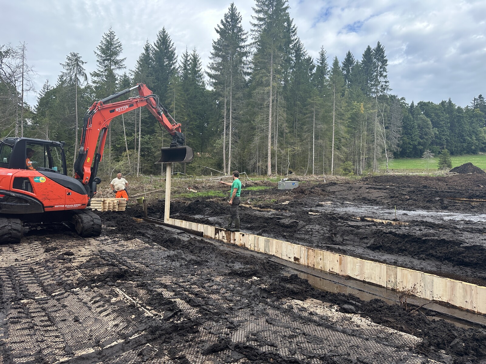 Travaux (septembre 2025) – Comblement du drain entre et sur les palissades avec de la tourbe prélevée dans le cadre des travaux des fosses délimitées pour n’exercer aucune influence sur le fonctionnement hydrologique du marais.