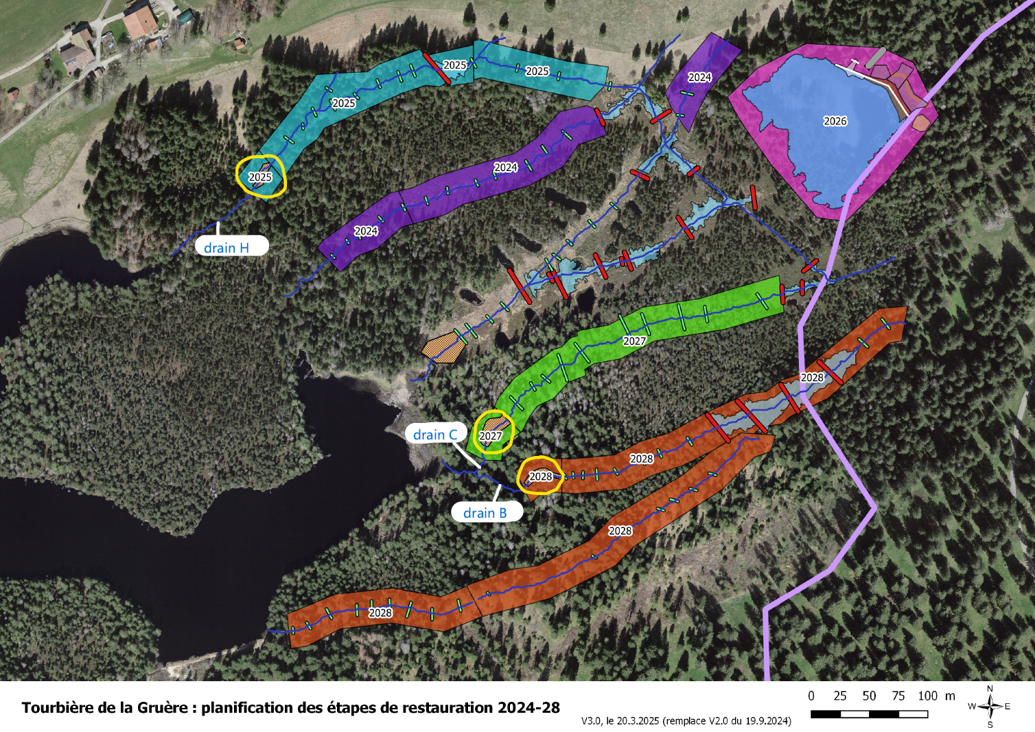 Plan général des étapes de revitalisation de la tourbière. Les secteurs concernés sont entourés en jaune.