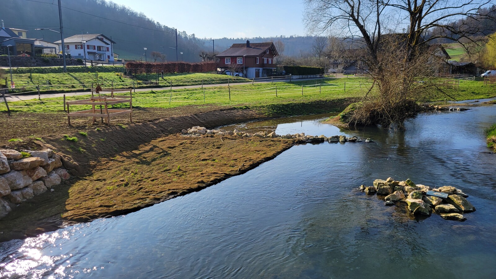 Etat réalisé (mars 2025) – vue depuis le pont en direction de l’amont et l’élargissement en rive droite (à gauche sur l’image)