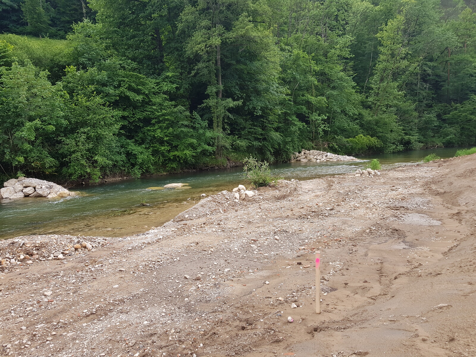 Etat réalisé (juillet 2022) – secteur amont : élargissement en rive gauche (à droite sur la photo) et aménagements de stabilisation et diversification en rive droite