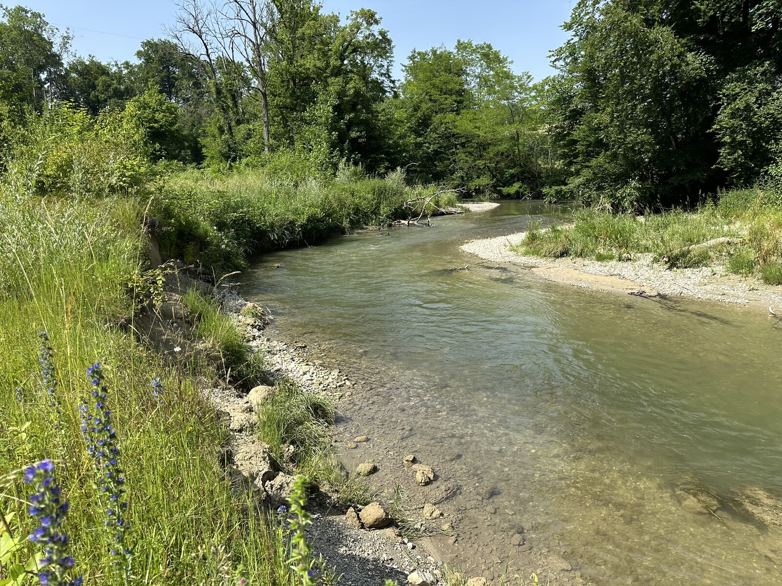 Etat réalisé (juin 2025) - évolution du cours d'eau et développement de la végétation 6 ans après les travaux