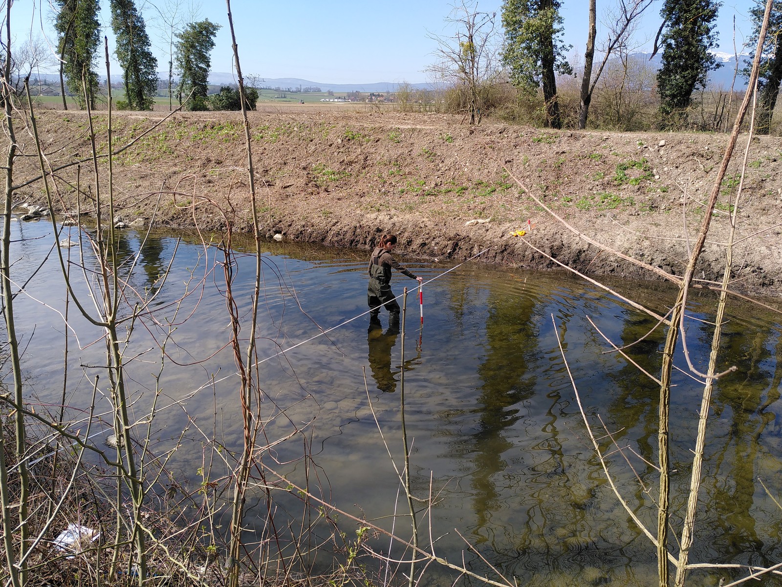 Prise de mesures de la profondeur des eaux, de la vitesse d’écoulement et du type de substrat avant revitalisation de l’Aire à Bernex et Perly-Certoux (GE). Ici, les données ont été récoltées tous les 80 cm sur 15 profils en travers.