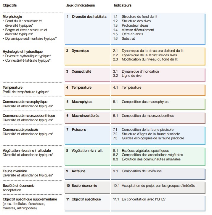 Objectifs liés à chaque jeu d’indicateurs (issu du document de l’OFEV « Contrôle des effets des revitalisations de cours d’eau »).