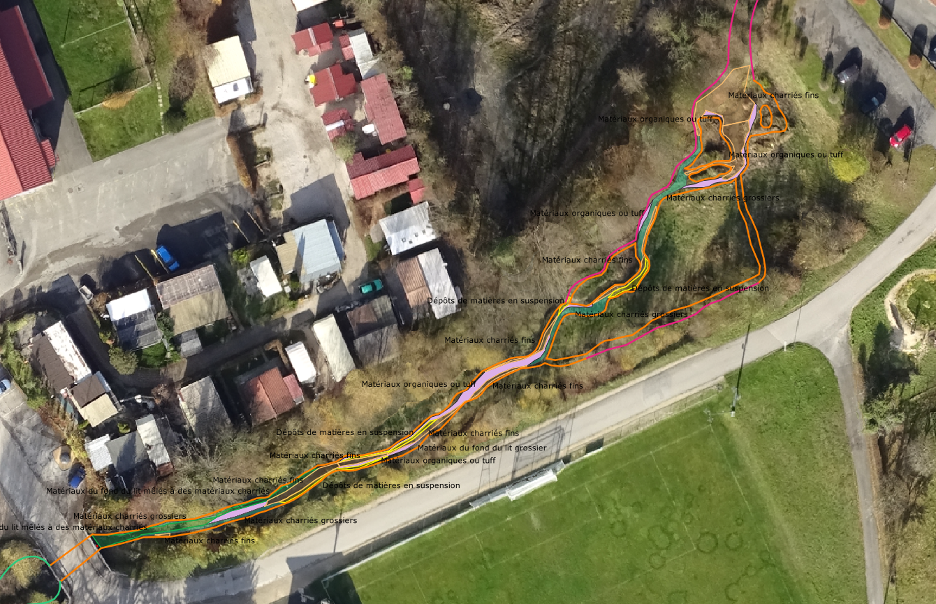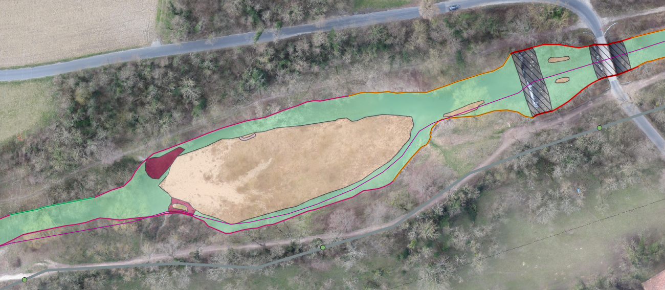 Extrait d’une cartographie du relevé de la structure des rives et du type de substrat après revitalisation du Malrang à St-Ursanne (JU).